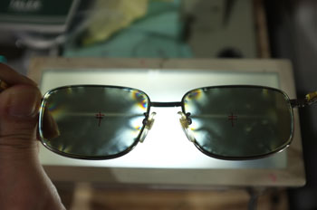 見にくいはずです。こんな加工、TALEXが見たら激怒するでしょう。こんな眼鏡を世に出したくないから、TALEXはプロショップ制度をひいています。小さなお店でもTALEXのレンズの良さを分かってくれて、性能を100%発揮できるよう、ツボを押さえた加工を丁寧にしてくれる店と提携しています。TALEXが少しでも見やすいよう、こだわりにこだわってレンズを製作し、プロショップがレンズの性能を引き出せるよう、歪み無くフレームにレンズをセットする。だからこそTALEXのサングラスの見え方はひと味違うんです。コレでないとダメと言われるんです。この方、どうやってこんなTALEXを購入されたんでしょうね。ひずみ計にあてたレンズの状態をお見せすると、納得され、その場で新たなサングラスをご購入いただきました。 6カーブのメタルフレームで、ひずみを消すのが難しいチタンフレームへのセットです。EYESで加工すると下のような感じに仕上げます。